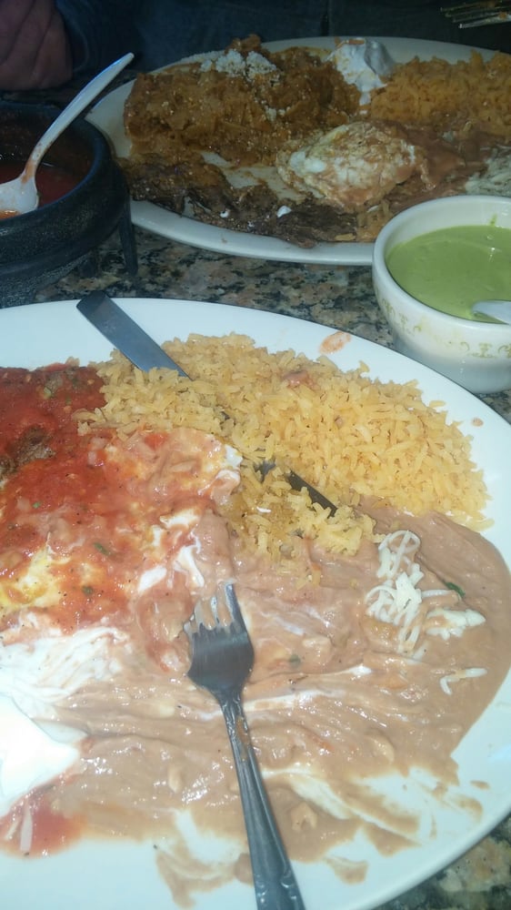 Two poblano peppers stuffed with cheese, fried in egg butter. Covered with special sauce and sour cream. Served with re-fried beans and rice.